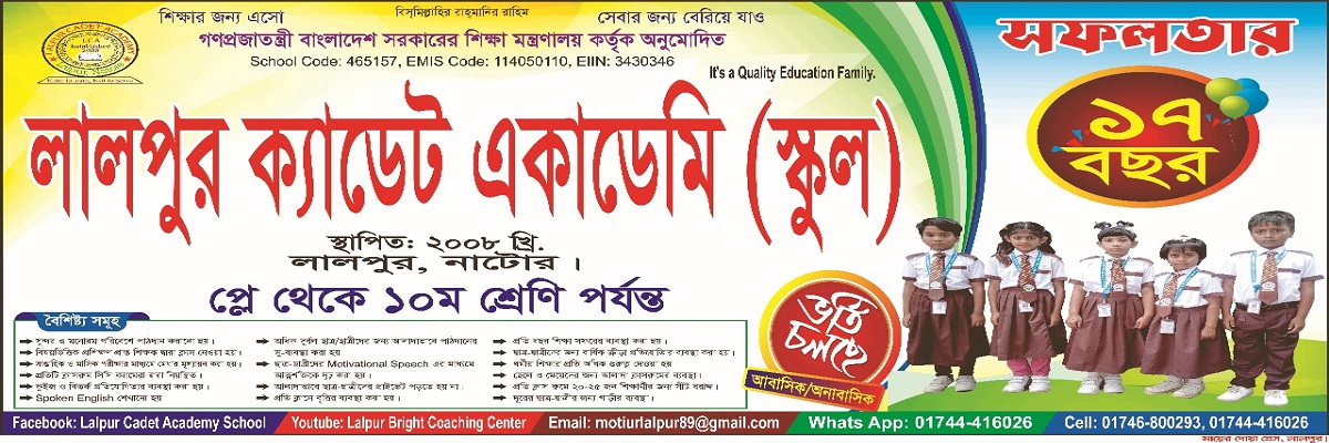 Lalpur Cadet Academy - এর পক্ষ থেকে জানাই স্বাগতম ও শুভেচ্ছা। পৃথিবীর সাথে তাল মিলিয়ে দেশ যখন এগিয়ে যাচ্ছে আমরা কেন তাহলে অন্যদের চেয়ে পিছিয়ে থাকবো ? আপনারা জেনে আনন্দিত হবেন যে, বাংলা একাডেমী কর্তৃক নির্ধারিত শুদ্ধ উচ্চারণের অঙ্গীকার নিয়ে আমরা সৃজনশীল শিক্ষা দানের উদ্দেশ্যে যুগোপযোগী ও আধুনিক স্কুল প্রতিষ্ঠার লক্ষ্যে একটি যুগান্তকারী উদ্যোগ গ্রহণ করেছি।